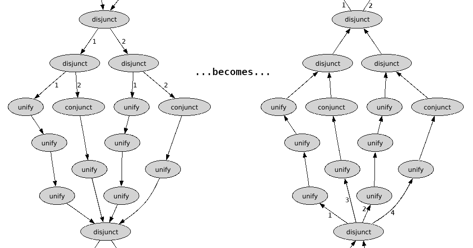 Goals are a little harder. Instead of modeling them as lambda expressions as in Scheme, they are +also made to be reference counted objects. Specifically, graph nodes. Each node is used to represent +the necessary details for either unify, disjunct, or conjunct. Building them up +node by node gives a resulting construction of a directed acyclic graph with a single node at the +top and a single empty node at the bottom.